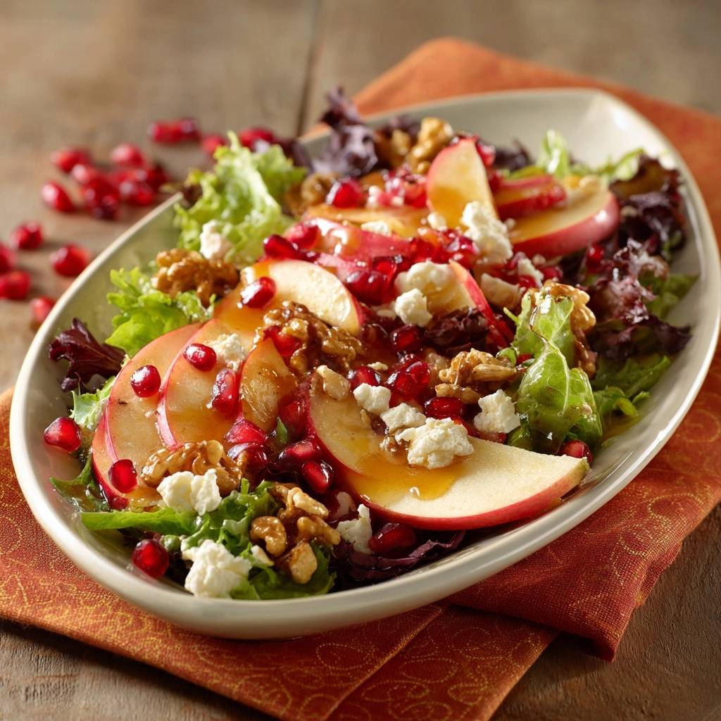 Pomegranate seeds deliver juicy pops of sweetness and antioxidants in Apple Pomegranate Feta Salad. Fresh arils taste brighter than store-bought; cut the fruit in half and tap out seeds over a bowl. Walnuts add earthy crunch when toasted.