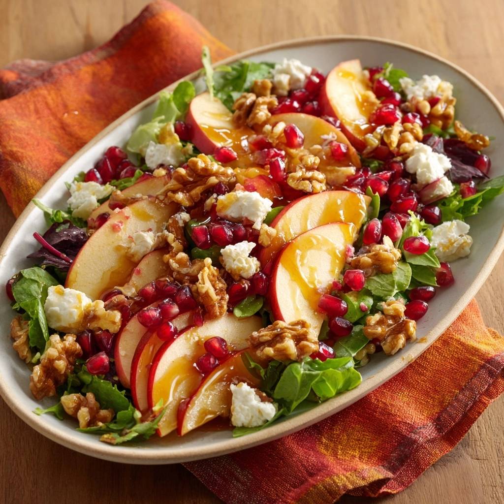 - Assemble the salad: In a large serving platter, layer mixed greens. Top with coated apples (still perfectly white), pomegranate seeds, toasted walnuts, and crumbled feta. Drizzle any remaining dressing from the bowl over top.