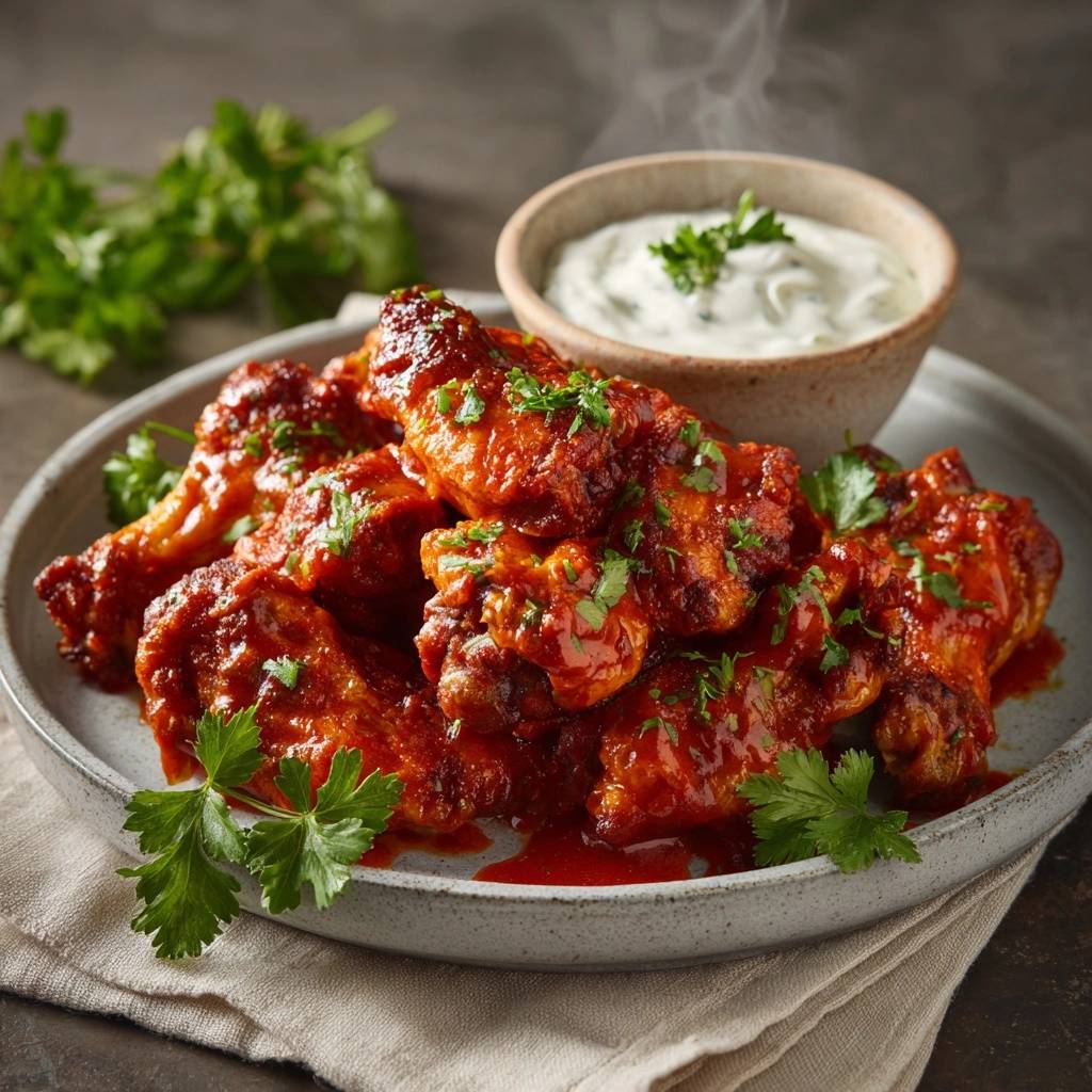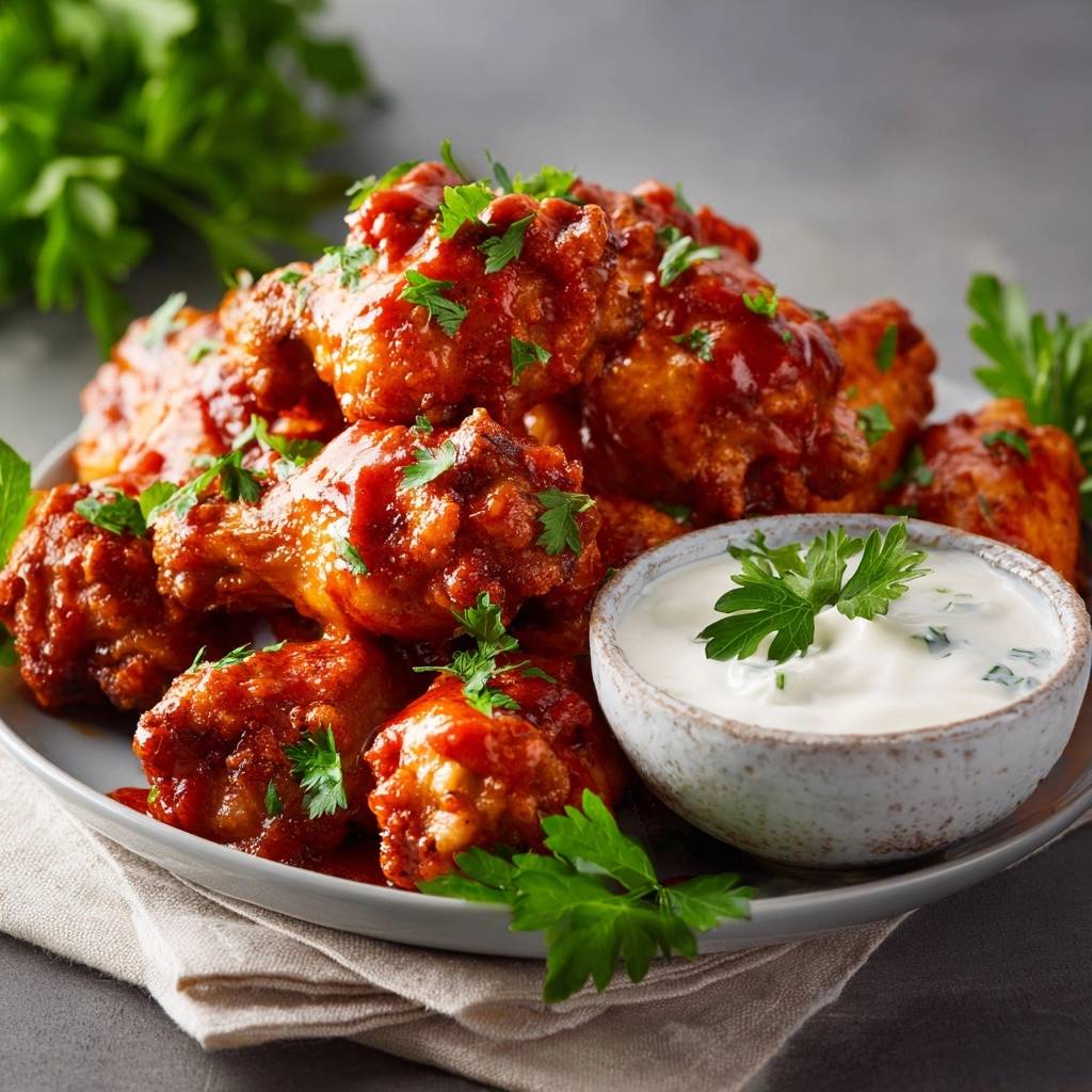 For sauce, whisk 2/3 cup hot sauce with 1/2 cup melted unsalted butter. Unsalted keeps sodium in check. The dip blends 1 cup Greek yogurt, 1/2 cup mayo, parsley, garlic powder, salt, and pepper for cool tang.