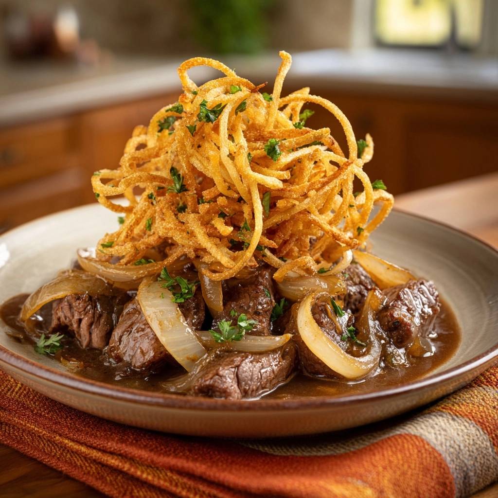 Nothing ruins a hearty beef bowl like soggy onion strings that turn limp and greasy the moment they touch gravy. You’ve been there, right? But this Beef and Onions with Crispy Onion Strings changes everything with shatteringly crisp toppings that stay crunchy for over 10 minutes, even piled high on steaming savory gravy.