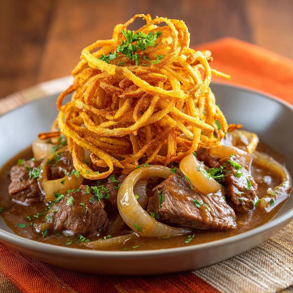 Braise beef and onions up to 3 days ahead; fridge in airtight container. Reheat gently on stovetop with splash of broth. Fry onion strings fresh for crunch.