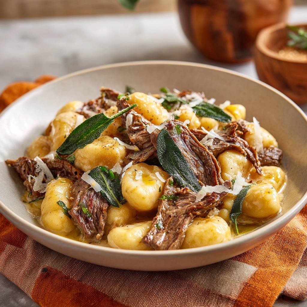 - Add shredded beef mixture to skillet with gnocchi. Toss gently over low heat 1 minute to coat evenly, wilting remaining sage leaves into the mix.