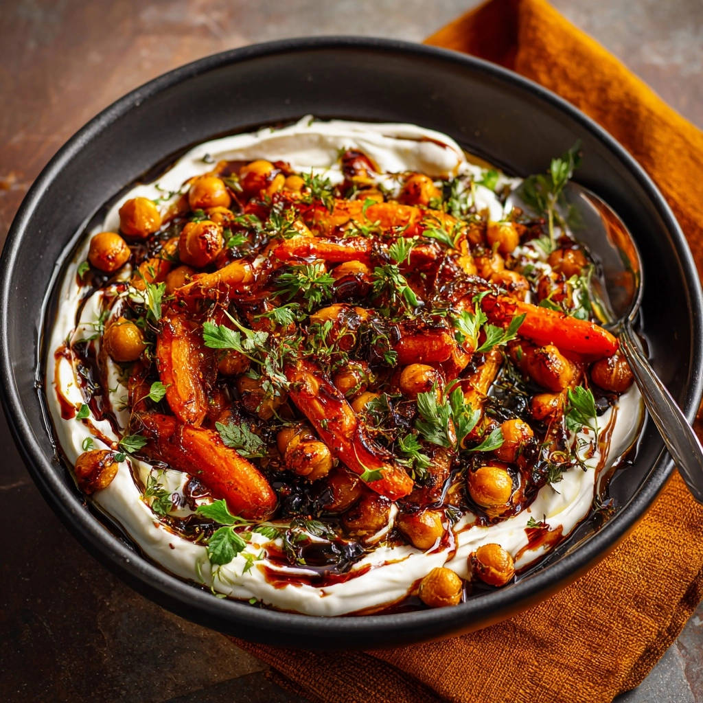 Once the carrots and chickpeas reach their peak roasted perfection, carefully transfer them from the baking sheet. Arrange the glistening vegetables artfully over the prepared yogurt base.