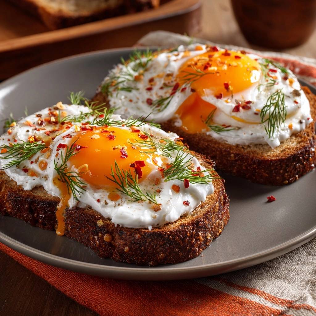 Foolproof sunny-side-up eggs on crisp seeded toast with cream cheese, fresh dill, and chili flakes. Perfectly set tops with runny yolks using a simple lid trick.
