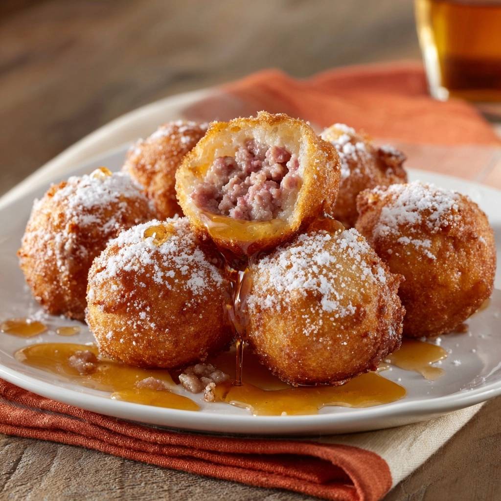 Golden, crispy breakfast bites featuring savory sausage centers wrapped in a light, airy pancake crust. A perfect solution for fully cooked centers every time.