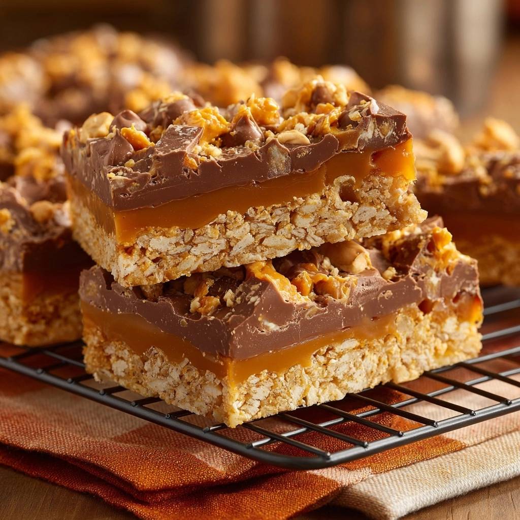 Learn the secret to the ultimate crunchy dessert bar with a moisture-proof cereal base, buttery caramel, and a chunky chocolate-peanut topping.