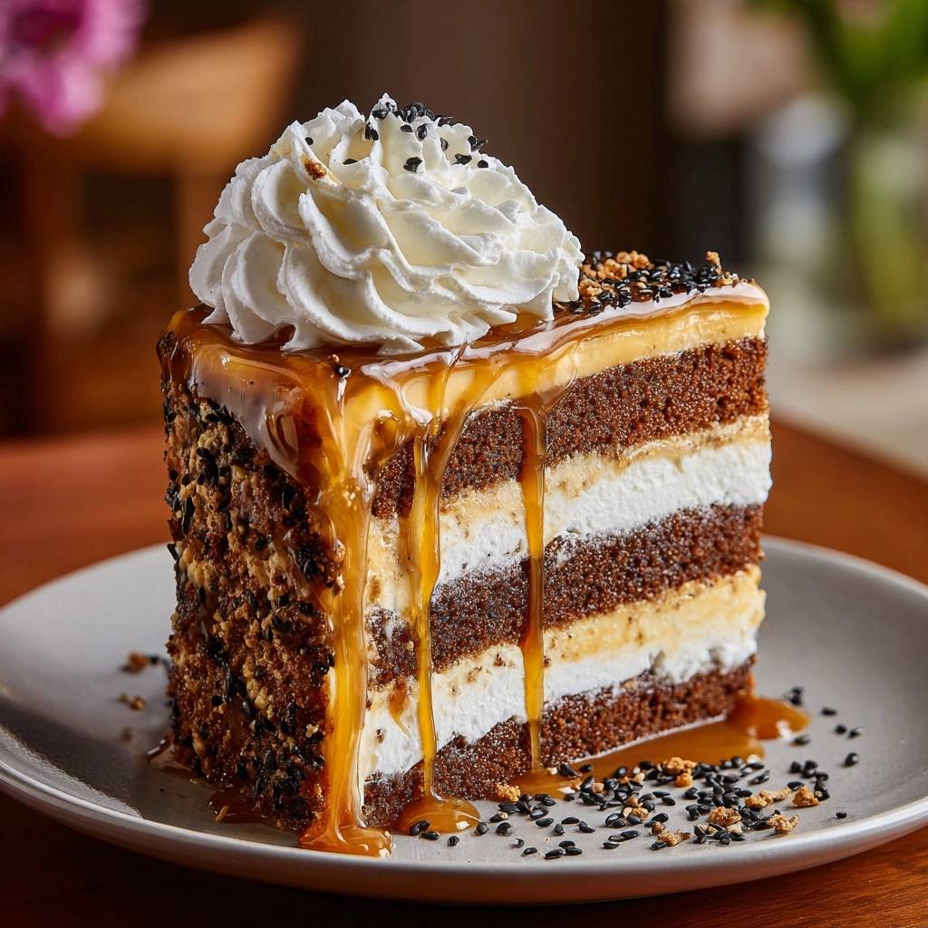 A foolproof salted caramel and black sesame layer cake featuring a unique temperature-staggering method to prevent cake sinking and ensure perfectly level layers.