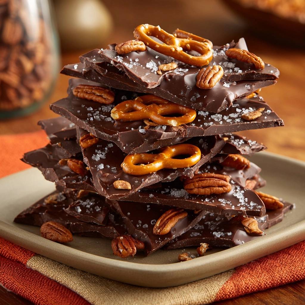 Learn how to make professional dark chocolate bark with pecans and pretzels that stay crunchy. This recipe uses a tempering method to prevent soggy pretzels.