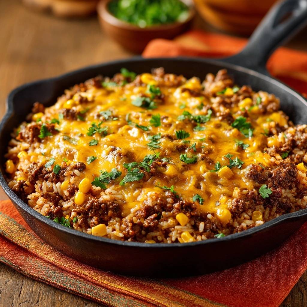 One-pan cheesy beef rice skillet with fluffy rice, corn, and cheddar. Toasting rice in beef fat prevents mushiness for perfect grains every time.