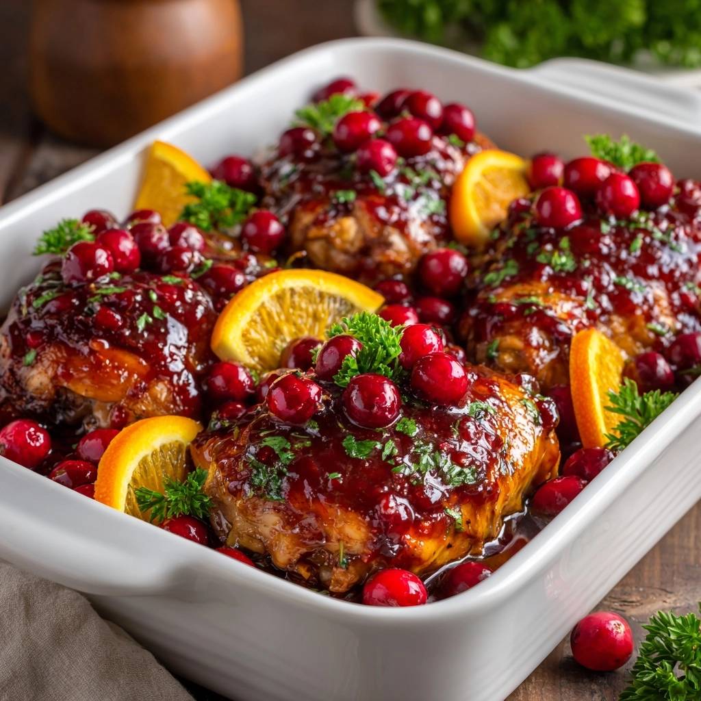 Juicy baked chicken thighs nestled on a bed of cranberries and orange slices, creating a glossy glaze for perfect tenderness every time.
