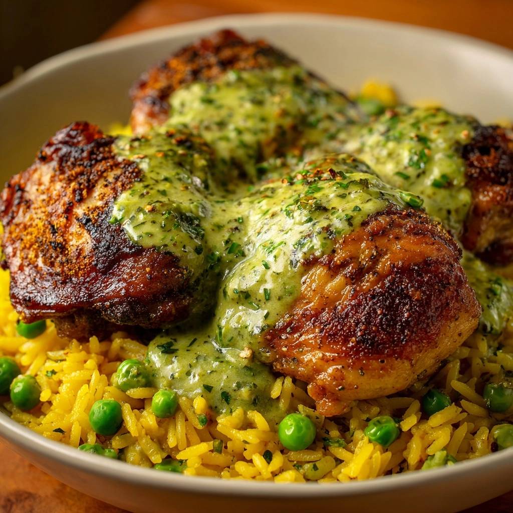 Foolproof crispy chicken thighs with zesty chimichurri sauce and fluffy turmeric pea rice. No more soggy skin!