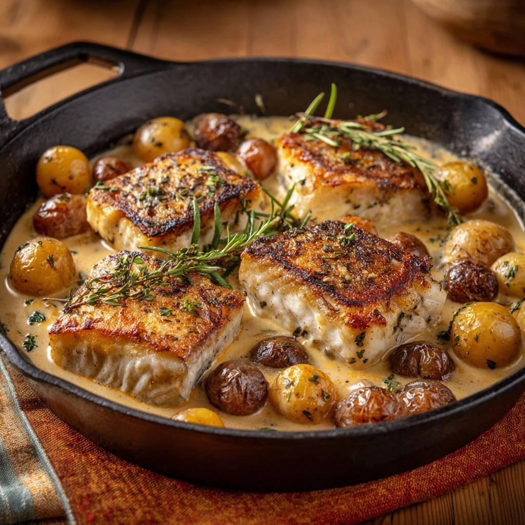 Juicy skillet-seared cod with crispy baby potatoes in a creamy rosemary sauce. Foolproof method for tender, never-dry fish in one pan.