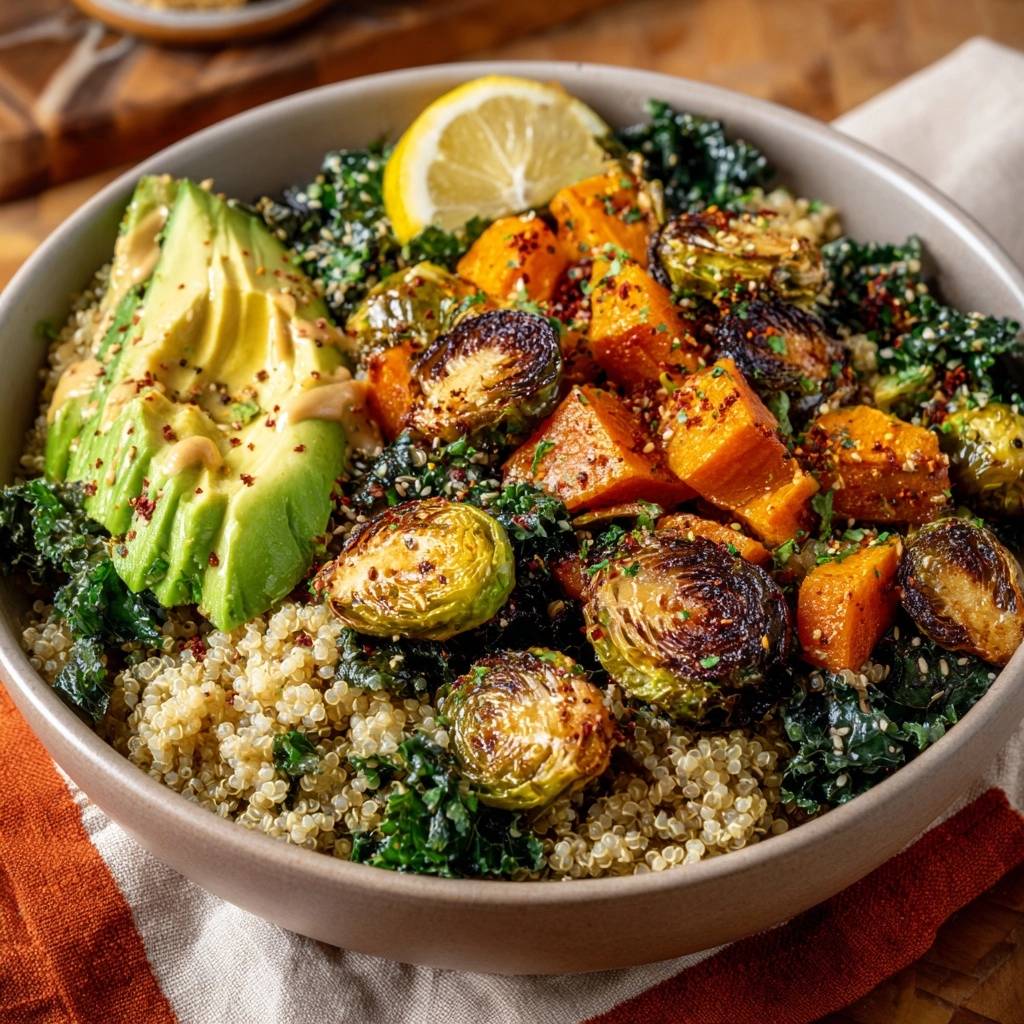Crispy roasted Brussels sprouts and sweet potatoes over fluffy quinoa and massaged kale make this power bowl a flavorful, filling meal with no mushy veggies.