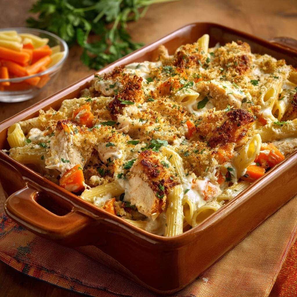 A foolproof creamy chicken and carrot pasta bake featuring a starch-locking technique to ensure a thick, velvety sauce that never turns watery.