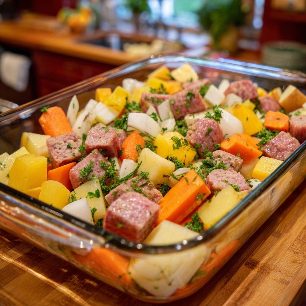 A tender and succulent vegetable medley cooked in a glass dish to ensure moist sausage and buttery root vegetables using a gentle steam method.