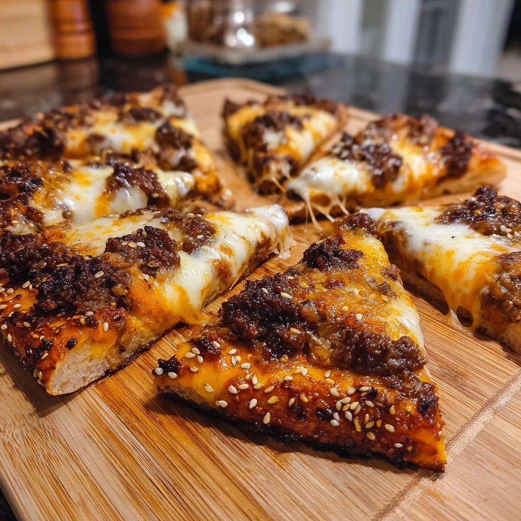 A crispy Sesame Beef Pan Pizza featuring a par-baked crust and a moisture-locking cheese barrier to prevent a soggy bottom.