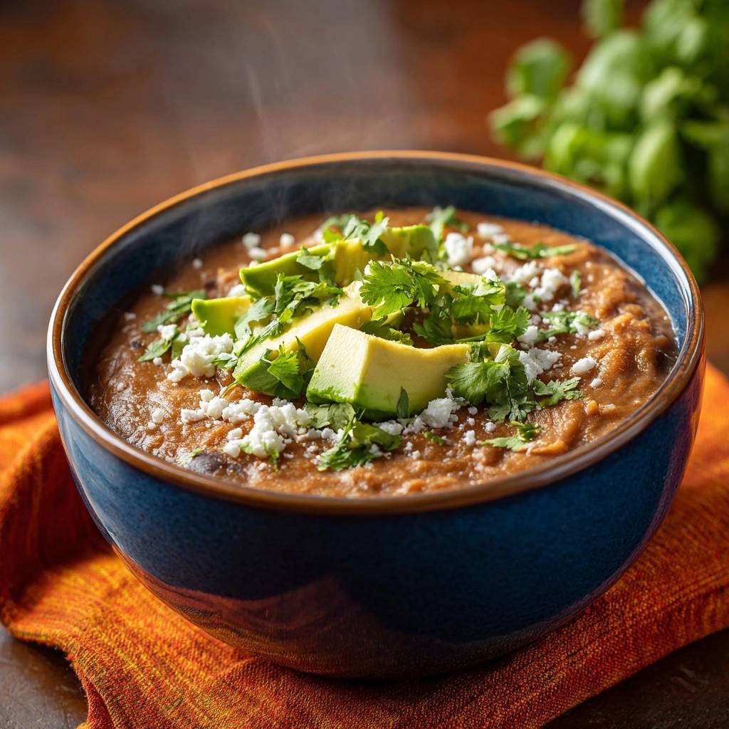 Foolproof creamy pinto bean soup pureed directly in the pot for thick, velvety texture without flour or thickeners. Topped with avocado, queso fresco, and cilantro.