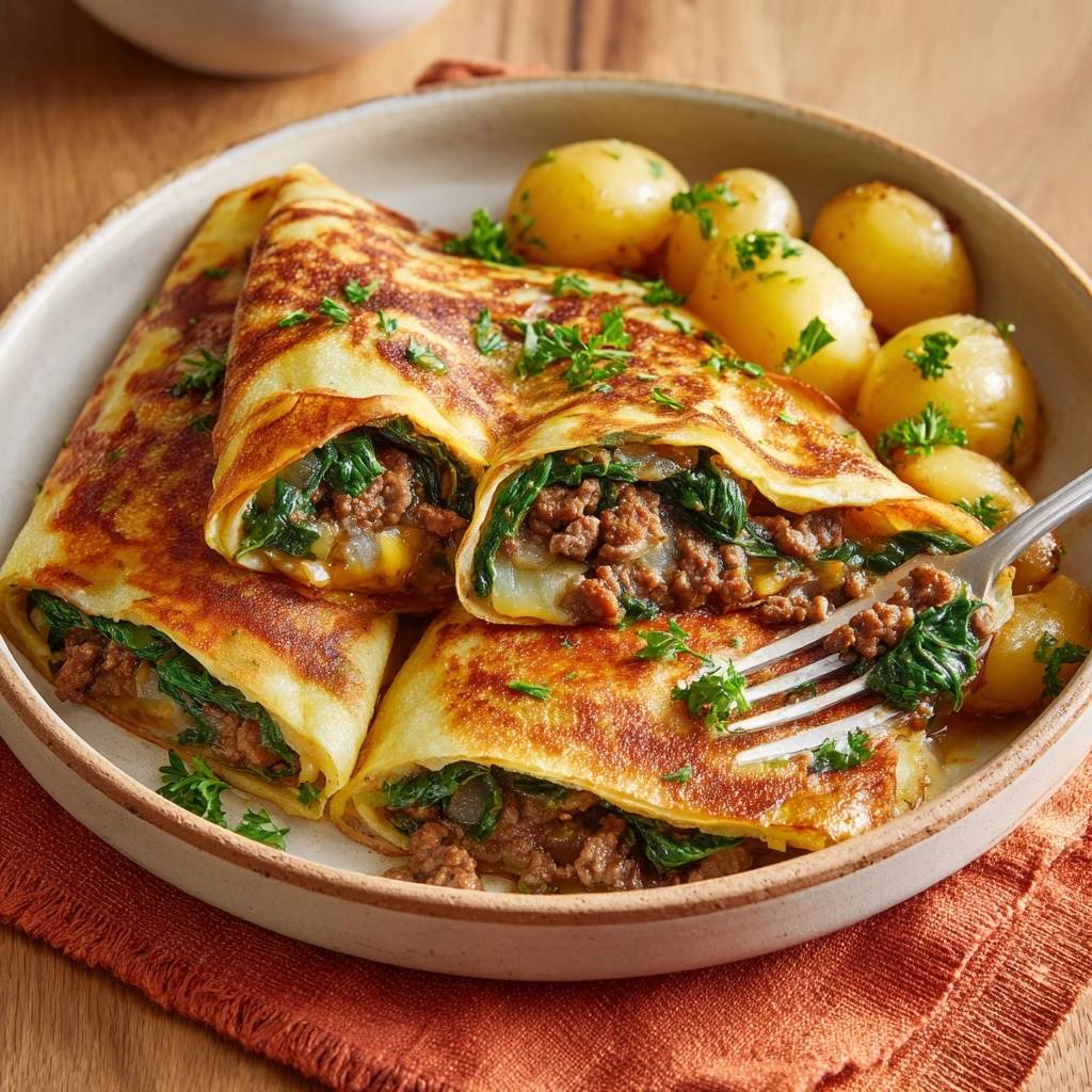Foolproof crepes with juicy beef and spinach filling, plus tender baby potatoes. No-tear batter trick guarantees perfect results every time.