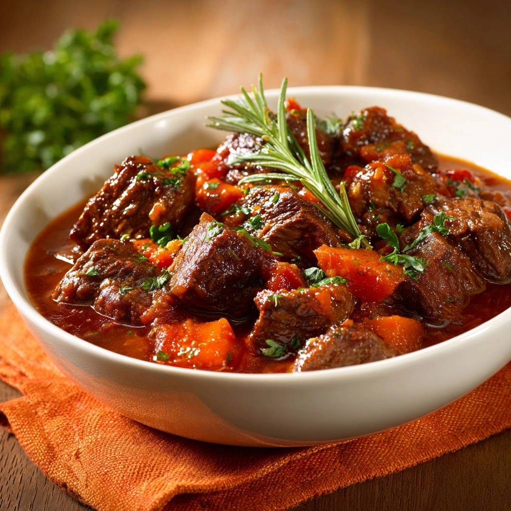 Fall-apart tender beef stew with carrots, tomatoes, and rosemary. Simple sear-then-simmer method guarantees juicy, melt-in-mouth beef every time.