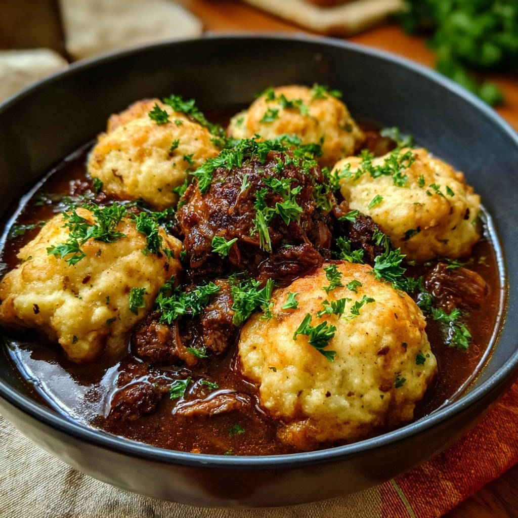 Comforting hearty beef stew with fluffy dumplings. Learn the secret to light, tender dumplings in this classic recipe.