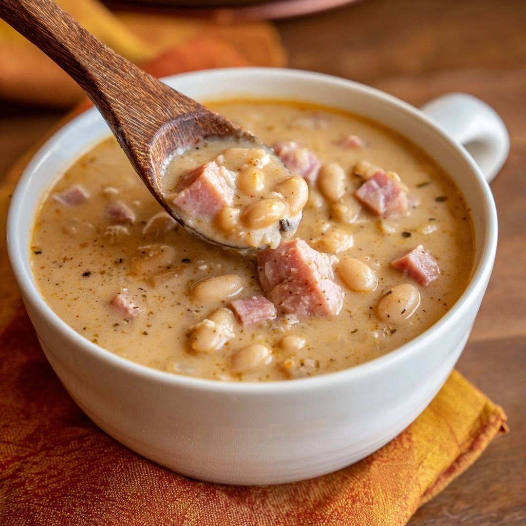 Thick and creamy ham and white bean soup made by pureeing half the beans for natural thickness without flour or extra fat. Hearty, cozy, and foolproof.
