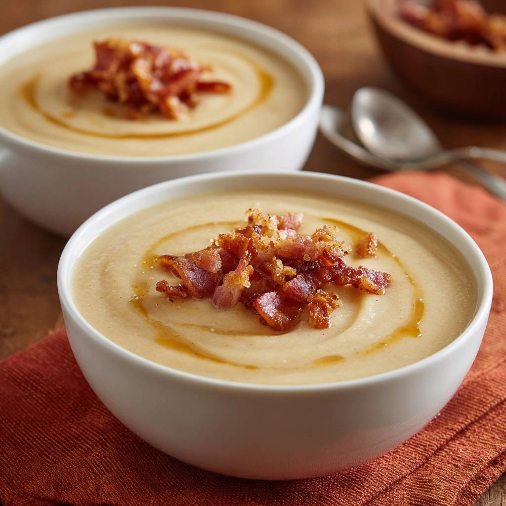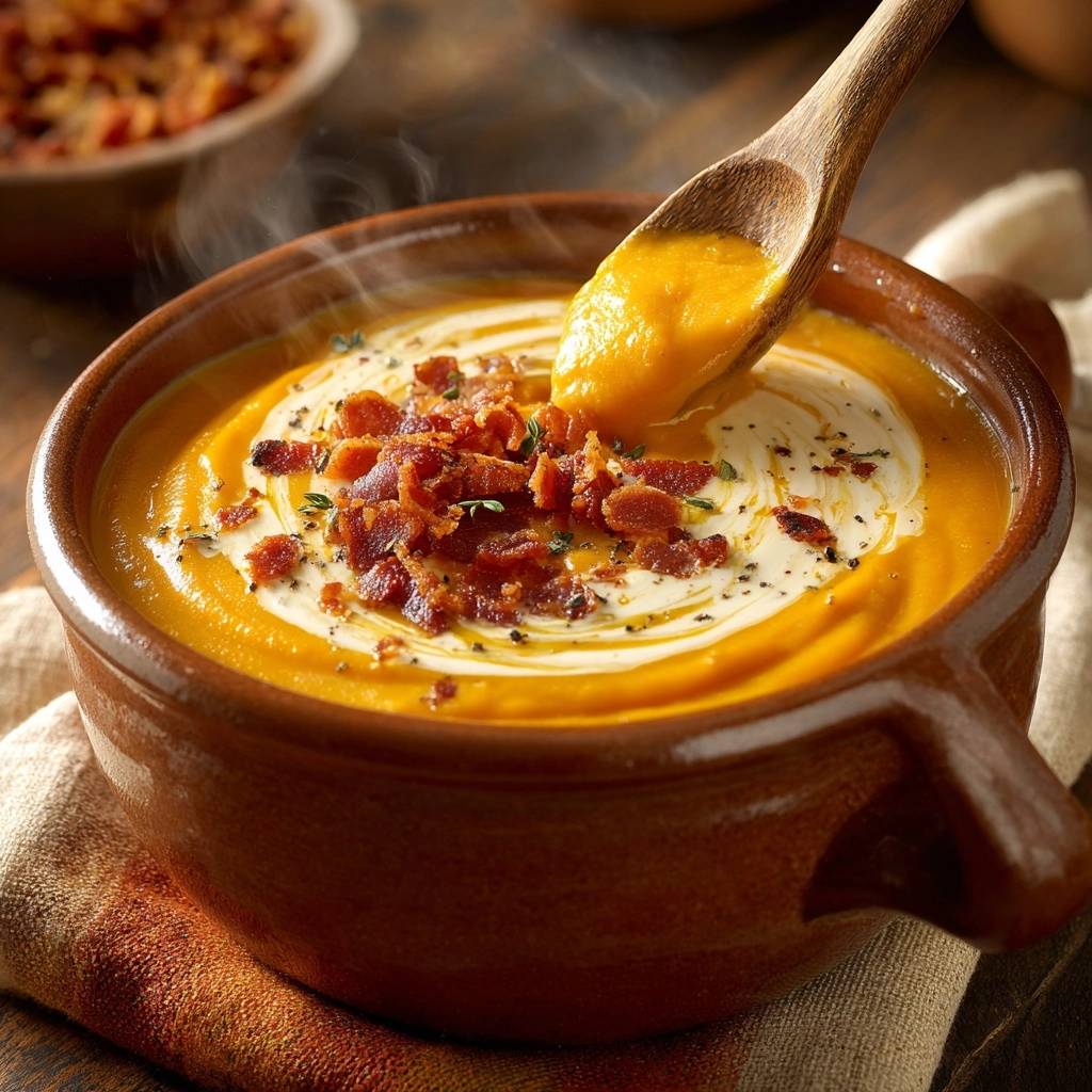 A velvety, ultra-thick butternut squash soup made by roasting vegetables to concentrate flavor and prevent a watery consistency. Topped with crispy beef bacon and fresh thyme.