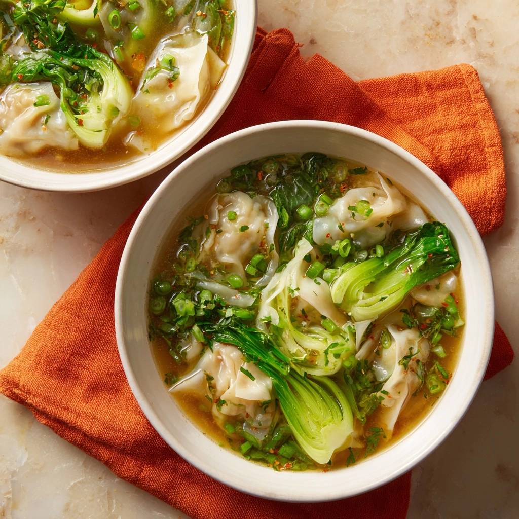 Homemade vegetable wonton soup with bok choy, snow peas, and scallions using a double-seal technique for perfect, intact dumplings in flavorful broth.