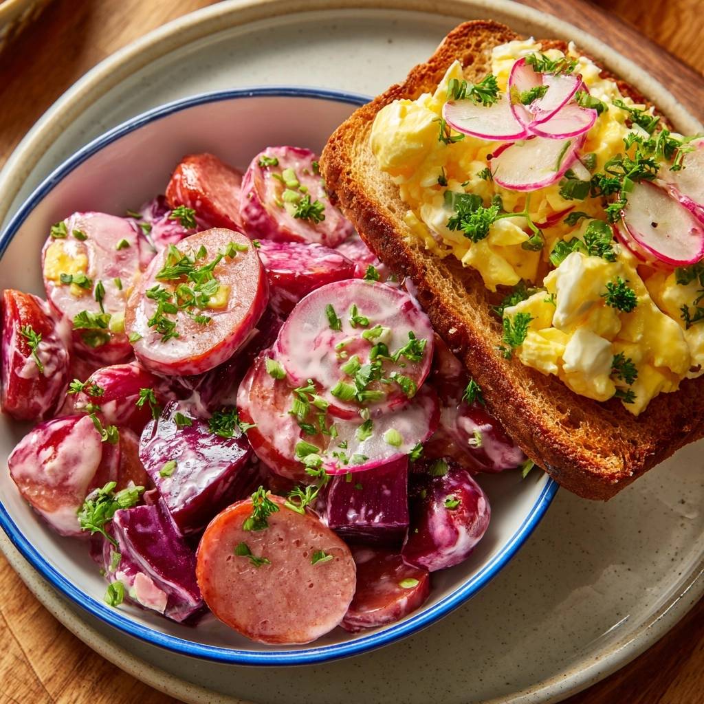 Creamy beet salad with sausage, eggs, and radishes featuring a draining trick for thick, never-watery dressing, served with soft-scrambled egg toast.