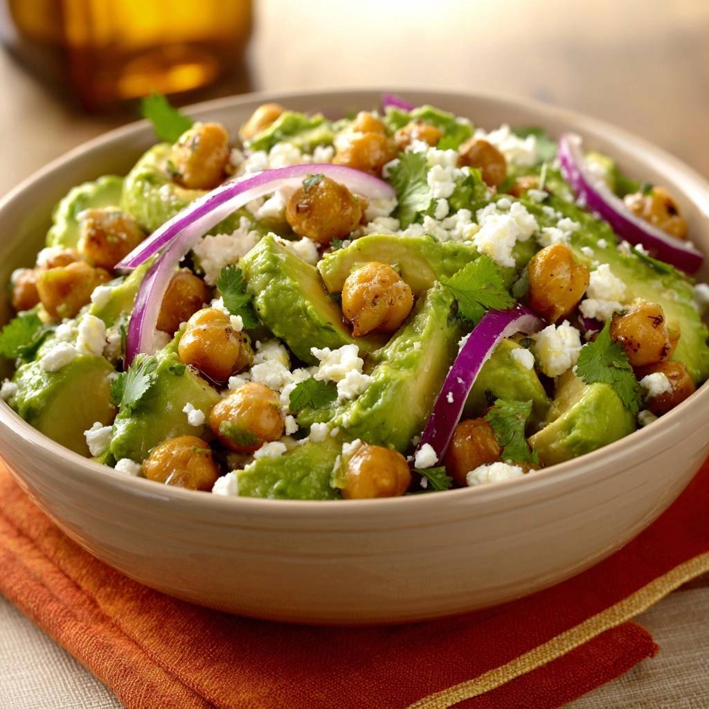 Crispy roasted chickpeas, creamy avocado, tangy feta, and fresh cilantro in a vibrant salad with bold spices and lime dressing.