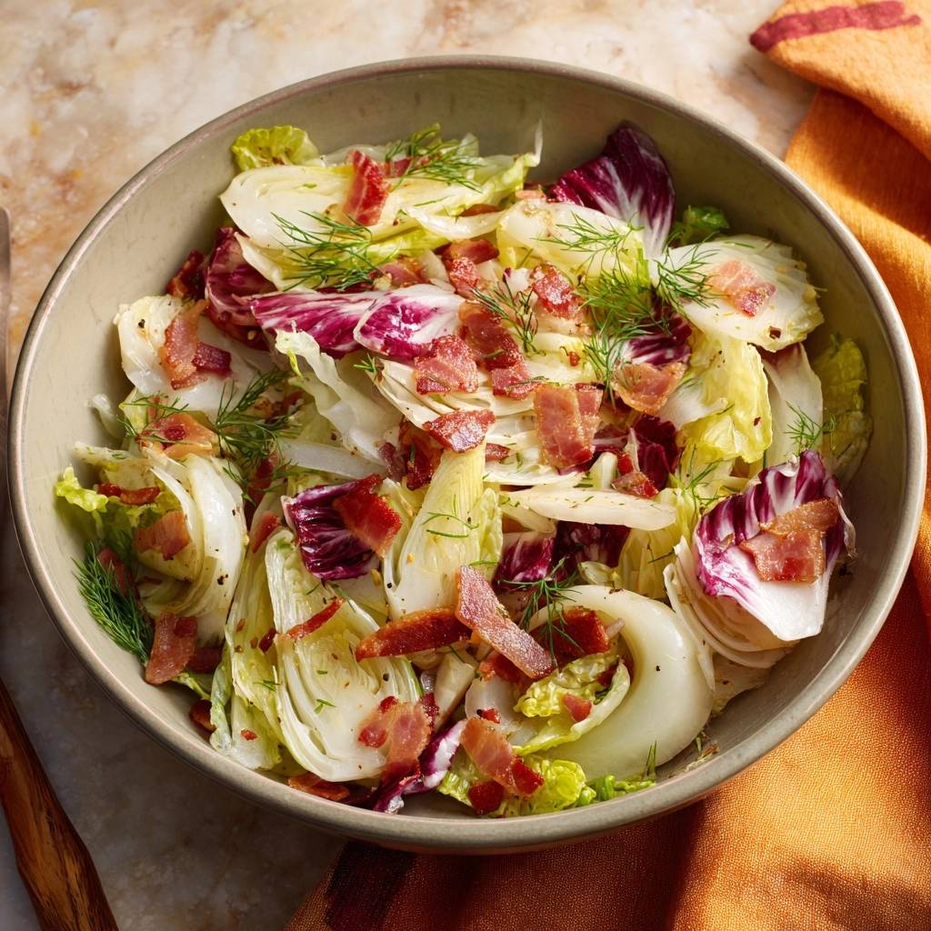 Ultra-crisp shaved fennel salad with smoky bacon, radicchio, frisee, and dill. Ice-water soak method prevents limp fennel for hours of perfect crunch.