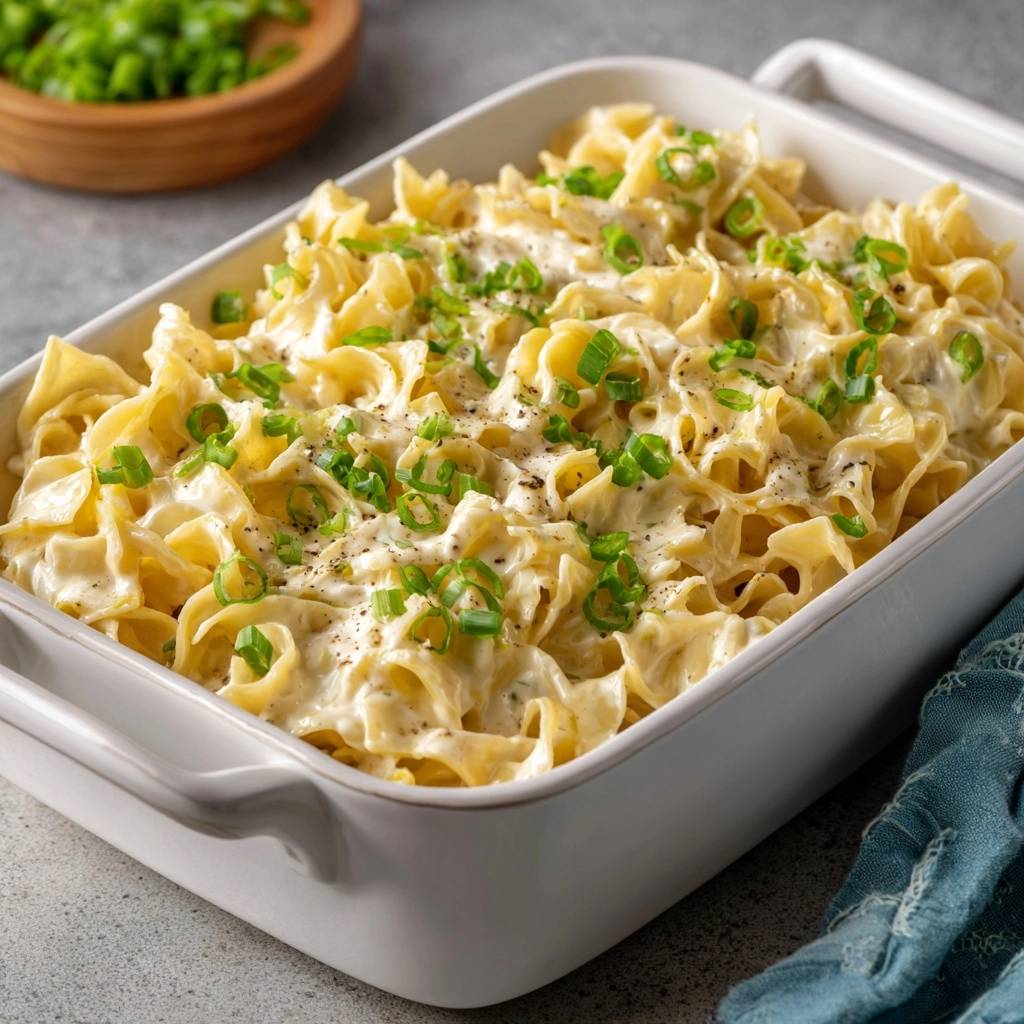 Tender, sauce-soaked baked egg noodles with sour cream, milk, and scallions. No more dry noodles—perfectly creamy every time!