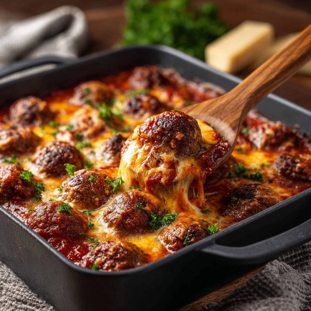 Double for 36 meatballs in 9×13 dish. Stores airtight 4 days fridge. Reheat oven over microwave for cheese integrity.