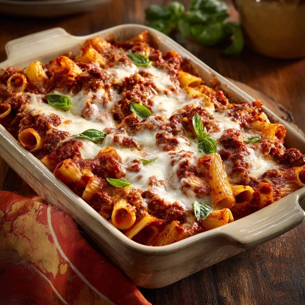 However, this cheesy baked rigatoni changes that. You undercook the pasta by 2 to 3 minutes, then toss it hot with a thick, reduced meat sauce. In addition, the pasta absorbs flavors perfectly without releasing starch, so you get bubbly cheese on top and firm, sliceable layers below. It’s restaurant quality at home.