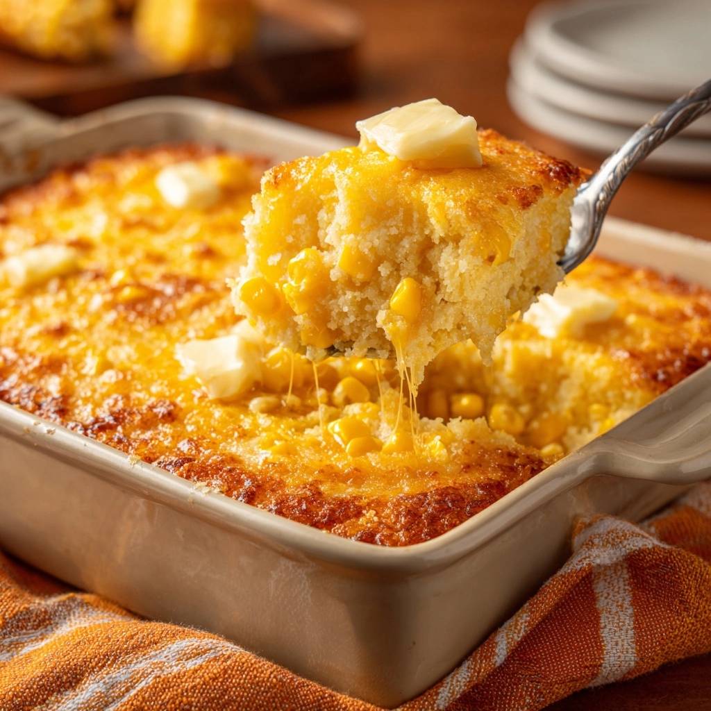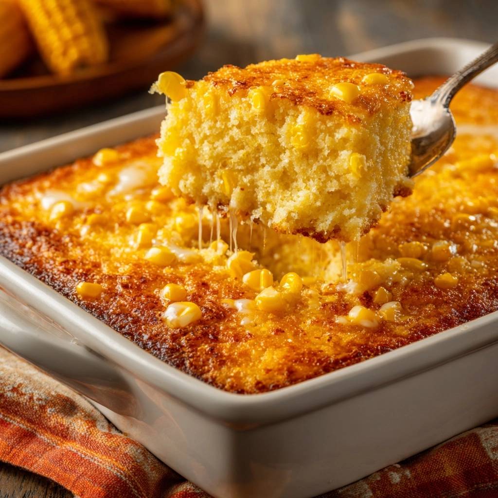 Rest 10 minutes post-bake. It firms up for clean slices, steaming with corn aroma. Perfect cheesy corn casserole pulls apart custardy and hot.