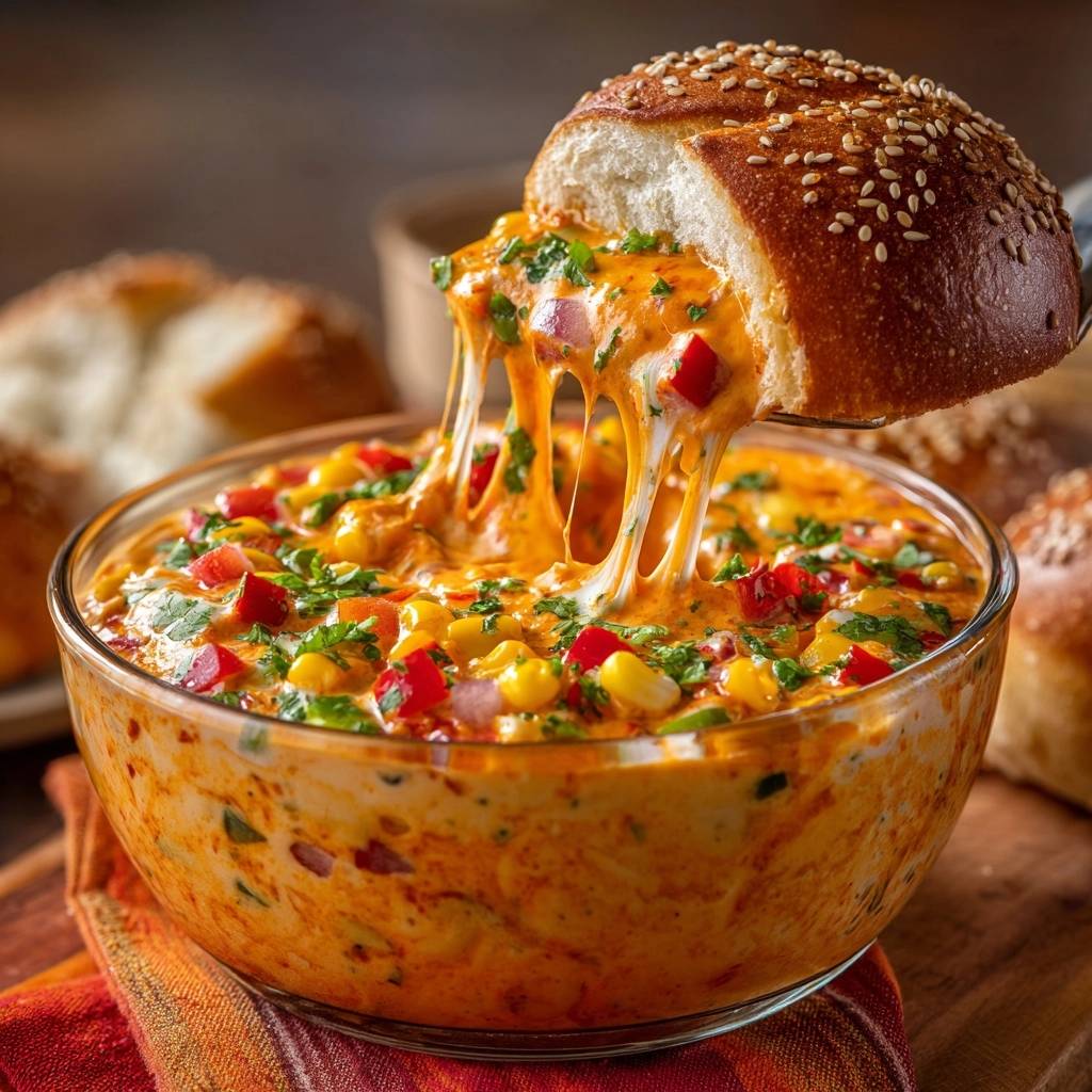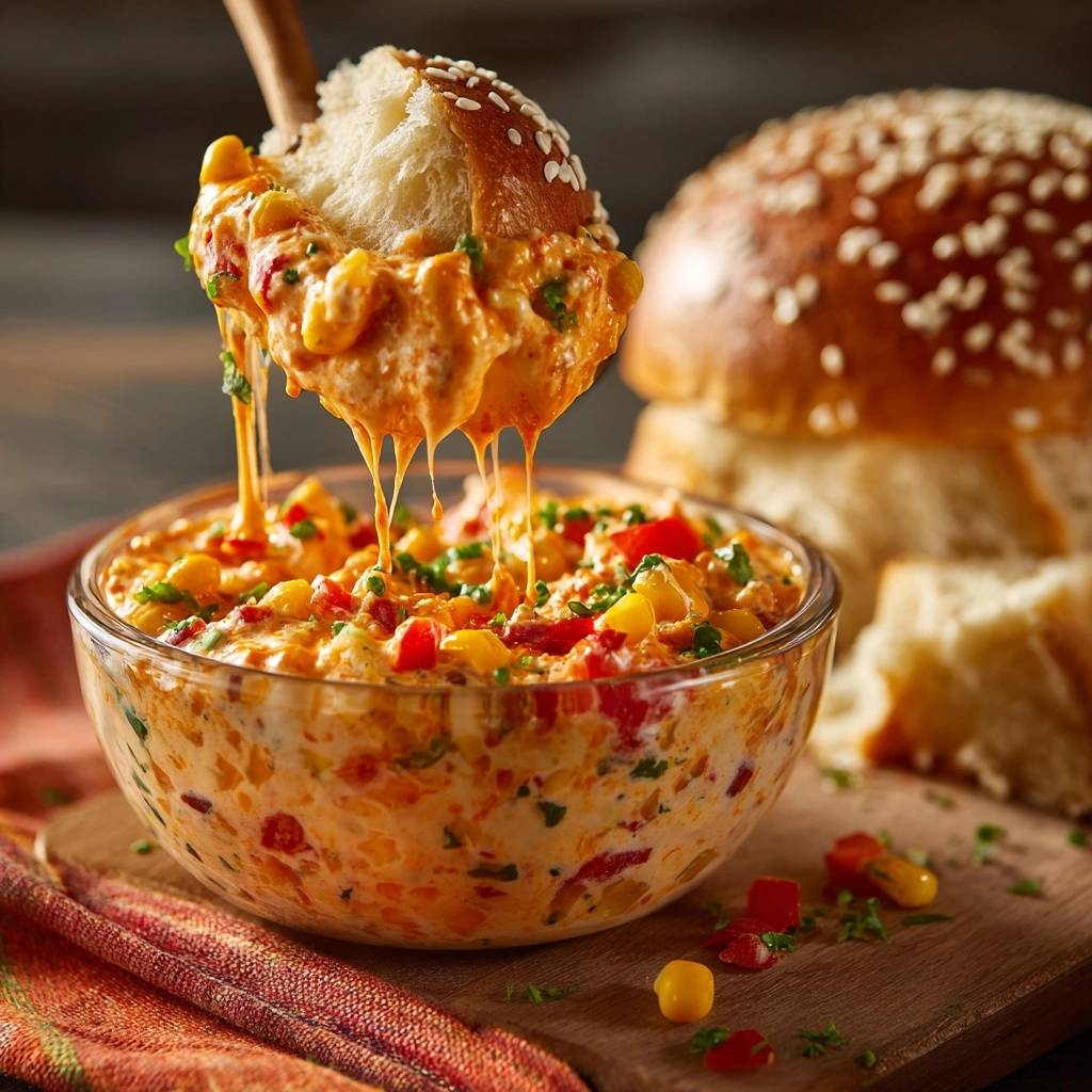 That’s why you’ll love it. Sweet corn pops against crisp red peppers, all wrapped in stretchy, smooth cheese that pulls endlessly. In addition, fresh herbs brighten every bite, and those pretzel buns add a salty chew that makes scooping irresistible.