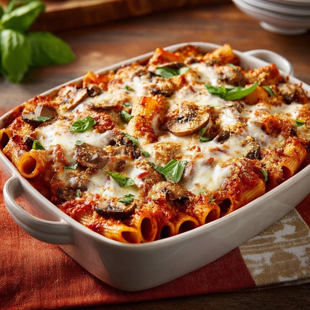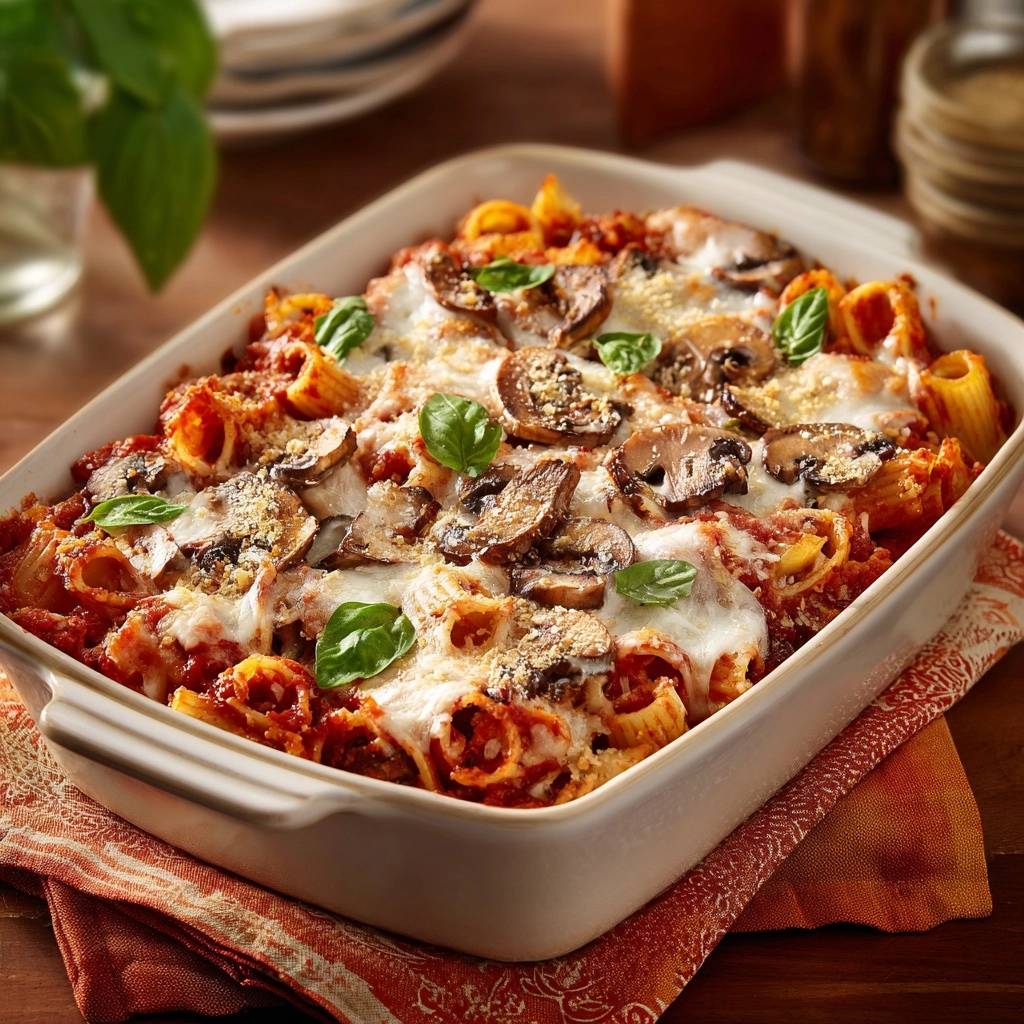 Mix pasta, mushrooms, marinara, and half the cheeses in a bowl. Transfer to a greased 9×13-inch dish, top with remaining cheese, and bake 20-25 minutes until bubbly and golden. Let rest 5 minutes; the structure sets for clean slices.