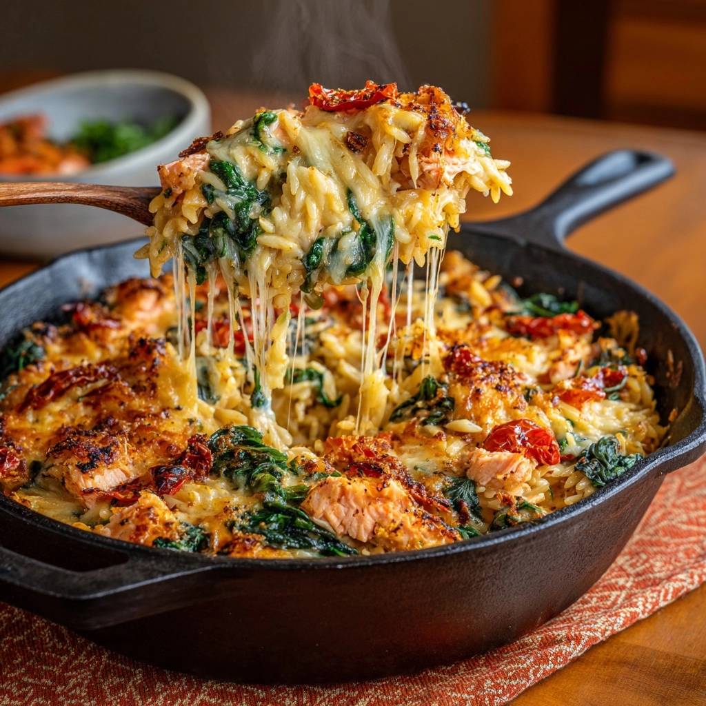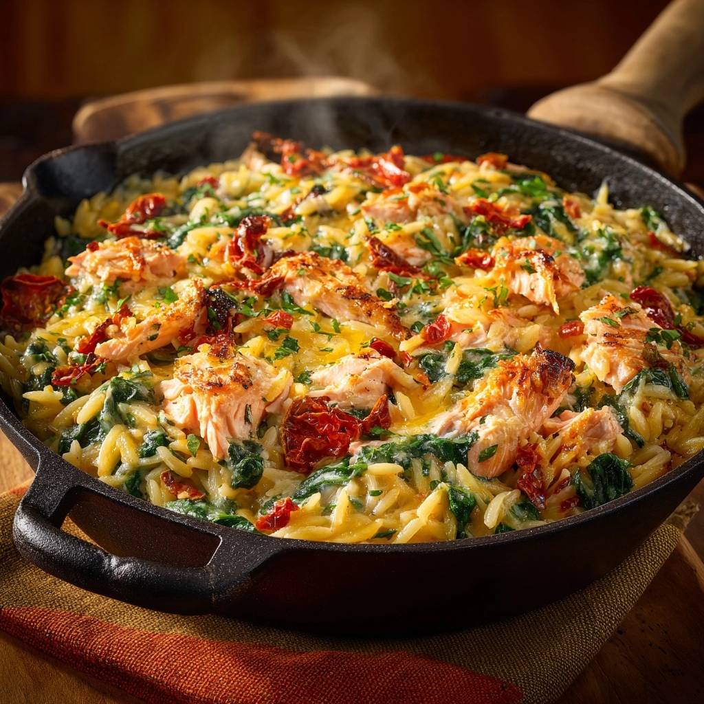 Cheesy Skillet Salmon Orzo with Spinach & Sun-Dried Tomatoes