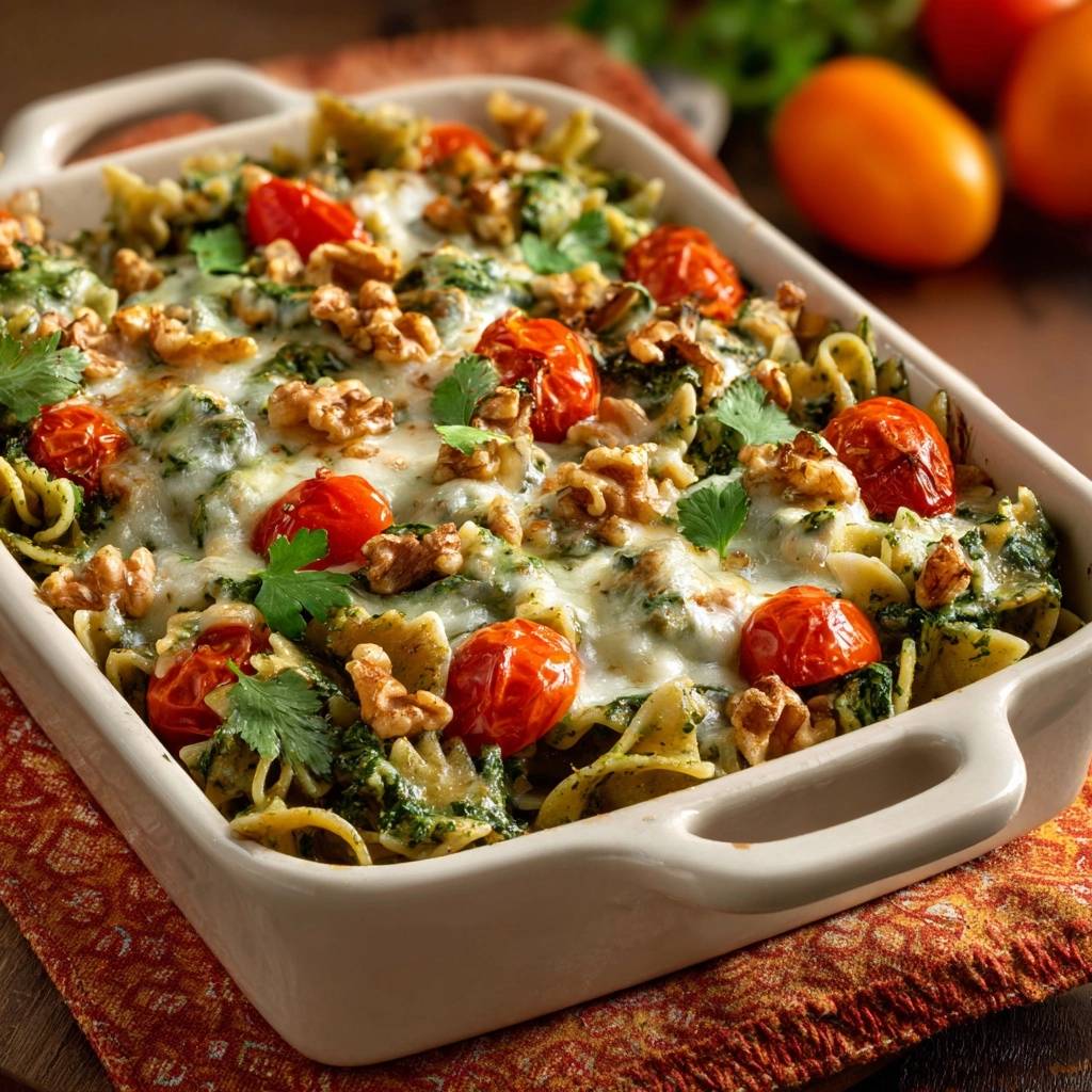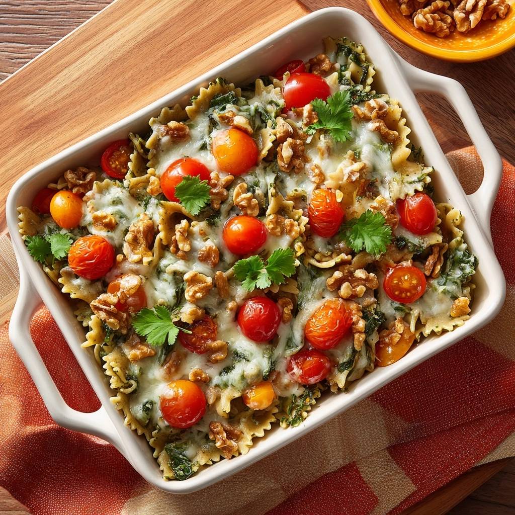 Cheesy Spinach Tomato Walnut Bowtie Pasta Bake