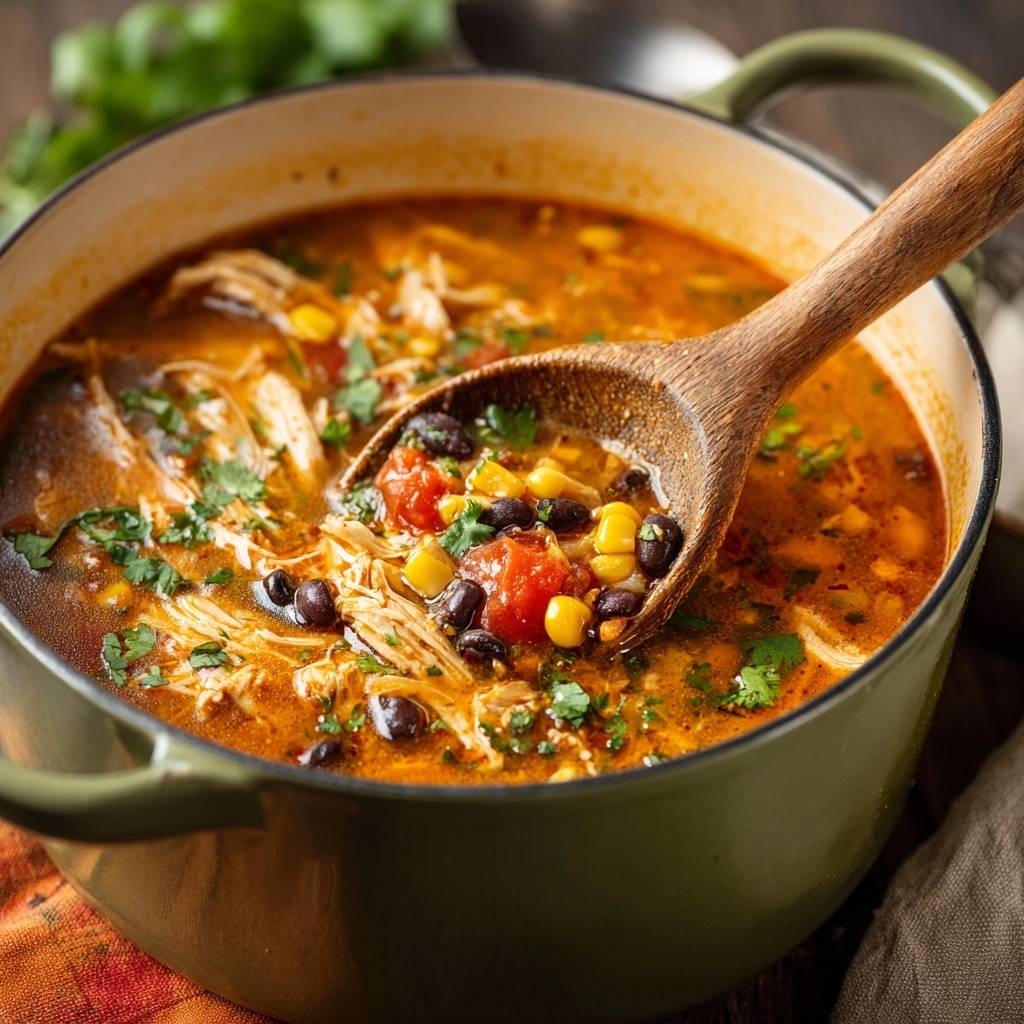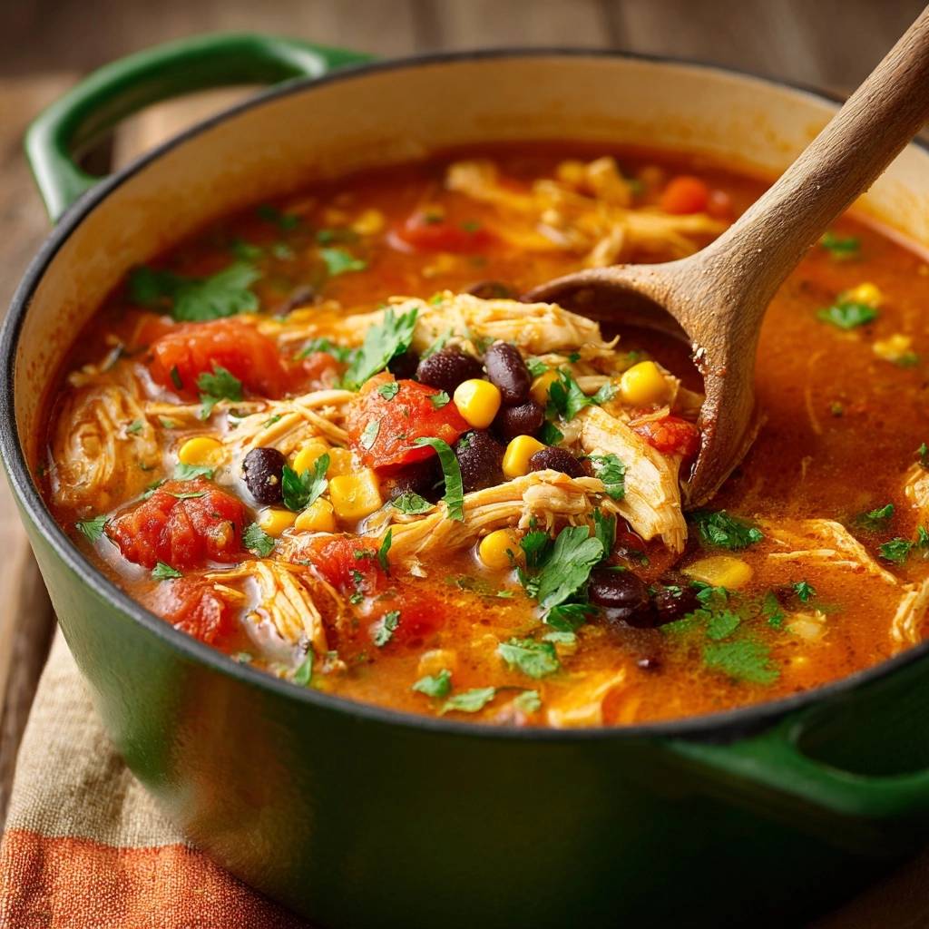 Shredded chicken provides hearty protein. Black beans and corn add fiber and pop. Diced tomatoes bring acidity to balance the spices, while chicken broth forms the base.