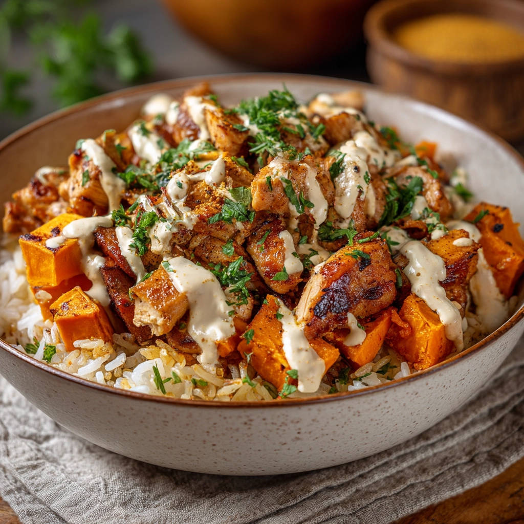 - To assemble the bowls, spoon cooked rice into bowls. Add the roasted sweet potato cubes and the perfectly seared juicy chicken. Drizzle generously with the tahini sauce and garnish with fresh chopped parsley or cilantro.