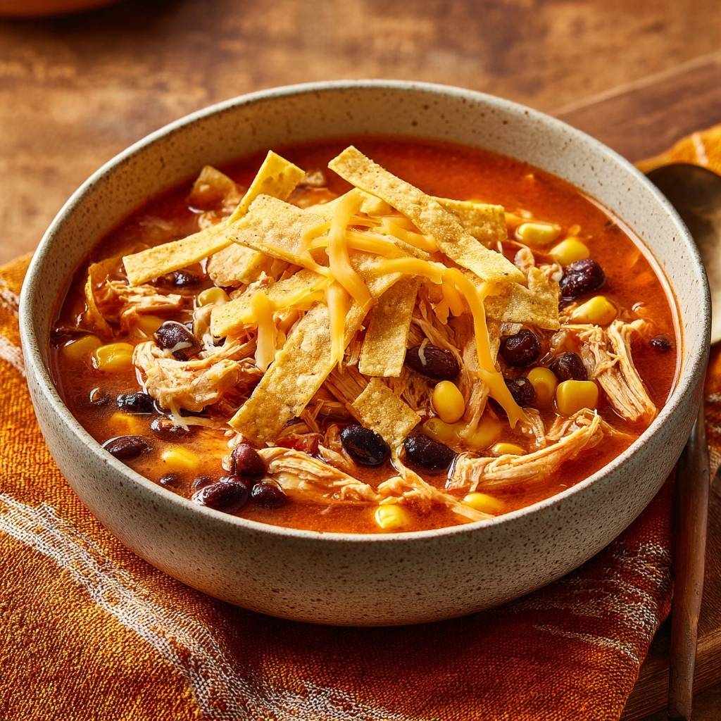 Season with 1 tbsp chili powder for earthy heat and 1 tsp cumin for warmth. Top with 6 corn tortillas cut into strips (no flour ones, they crisp poorly), 2 cups shredded cheddar (melts smoothly), 1/4 cup chopped cilantro, and lime wedges. Metric: 450g chicken, 400ml broth per cup.