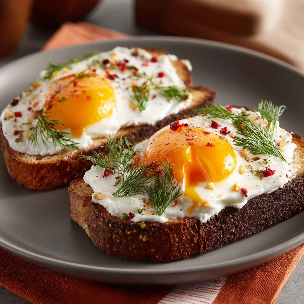 Absolutely. Use plant-based cream cheese, tofu scrambled sunny-side-up style (press firm tofu, season, and lid-steam), and seed bread. Skip butter for oil. Top with dill and flakes same way. It mimics the creaminess and runniness closely for 10-minute vegan bliss.