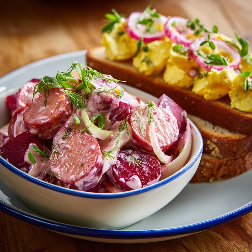 Therefore, imagine vibrant red beets coated in velvety sour cream and mayo, mixed with savory beef sausage rounds and crisp radishes. In addition, soft-scrambled eggs on crusty toast add fluffy contrast. Plus, beets pack antioxidants, while eggs and sausage deliver protein for a satisfying meal.