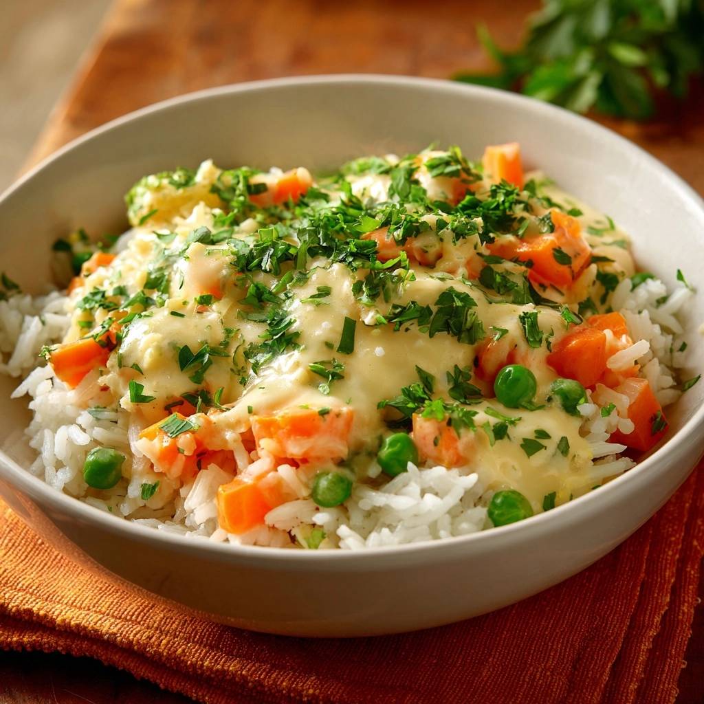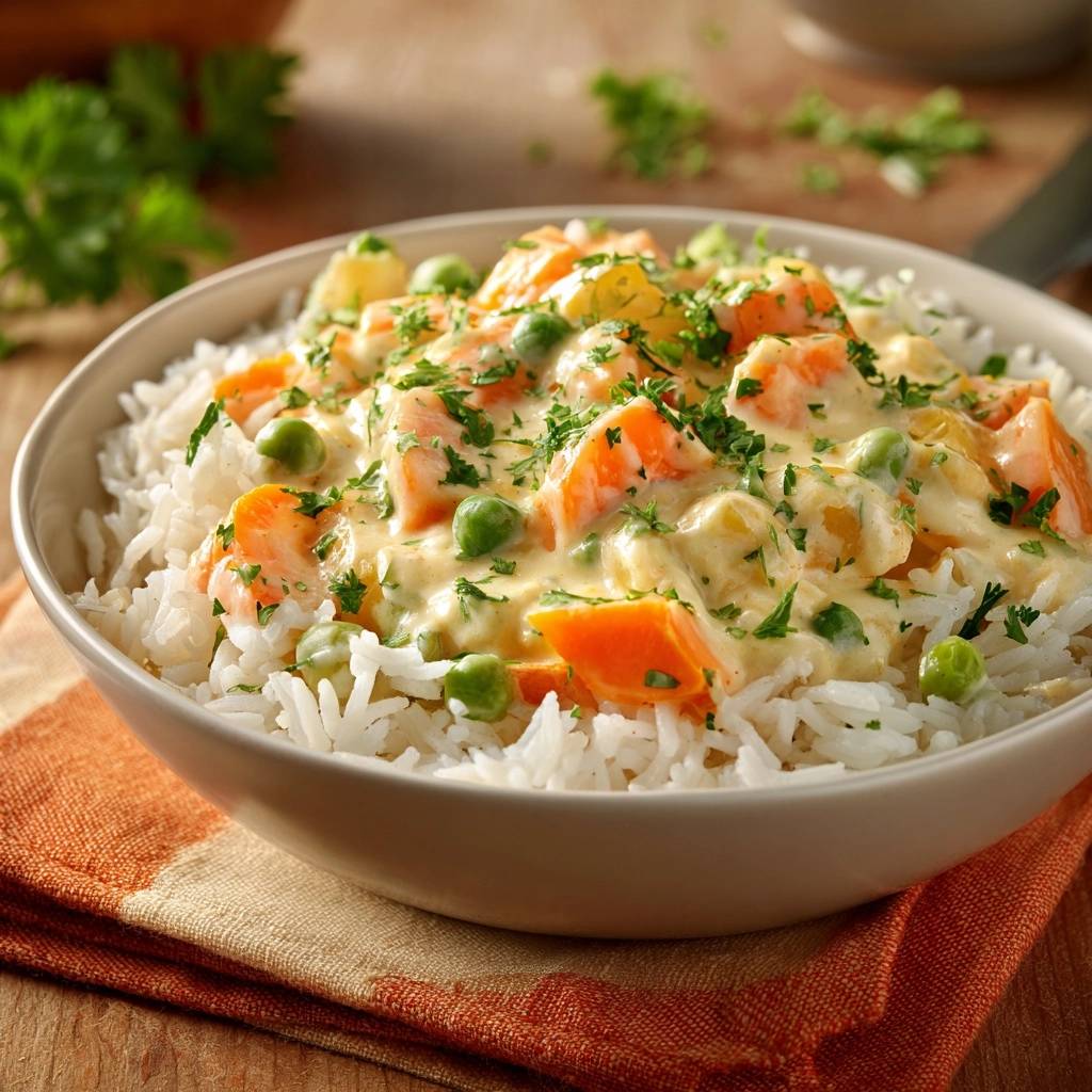 Divide 2 cups rice into bowls. Spoon hot veggie-cream mix over top generously. Warm ceramic bowls hold heat, melding flavors.