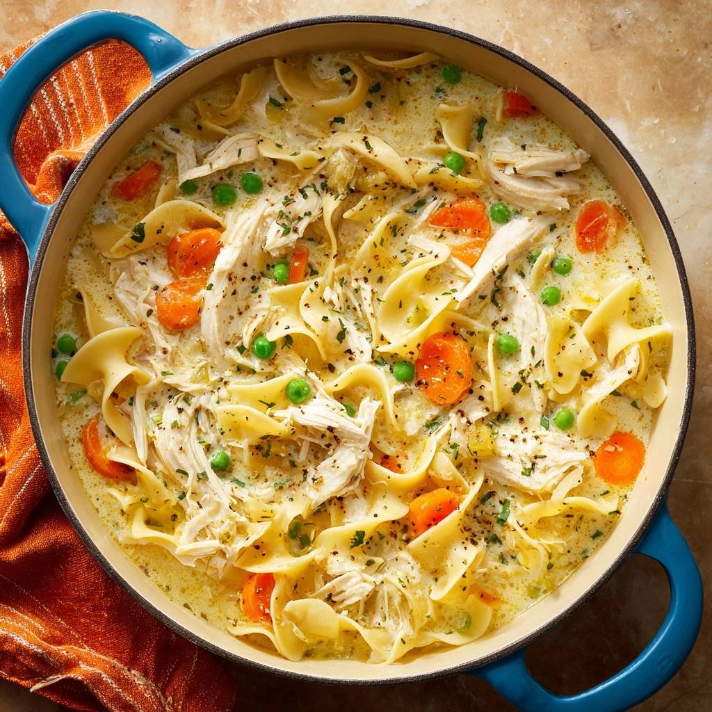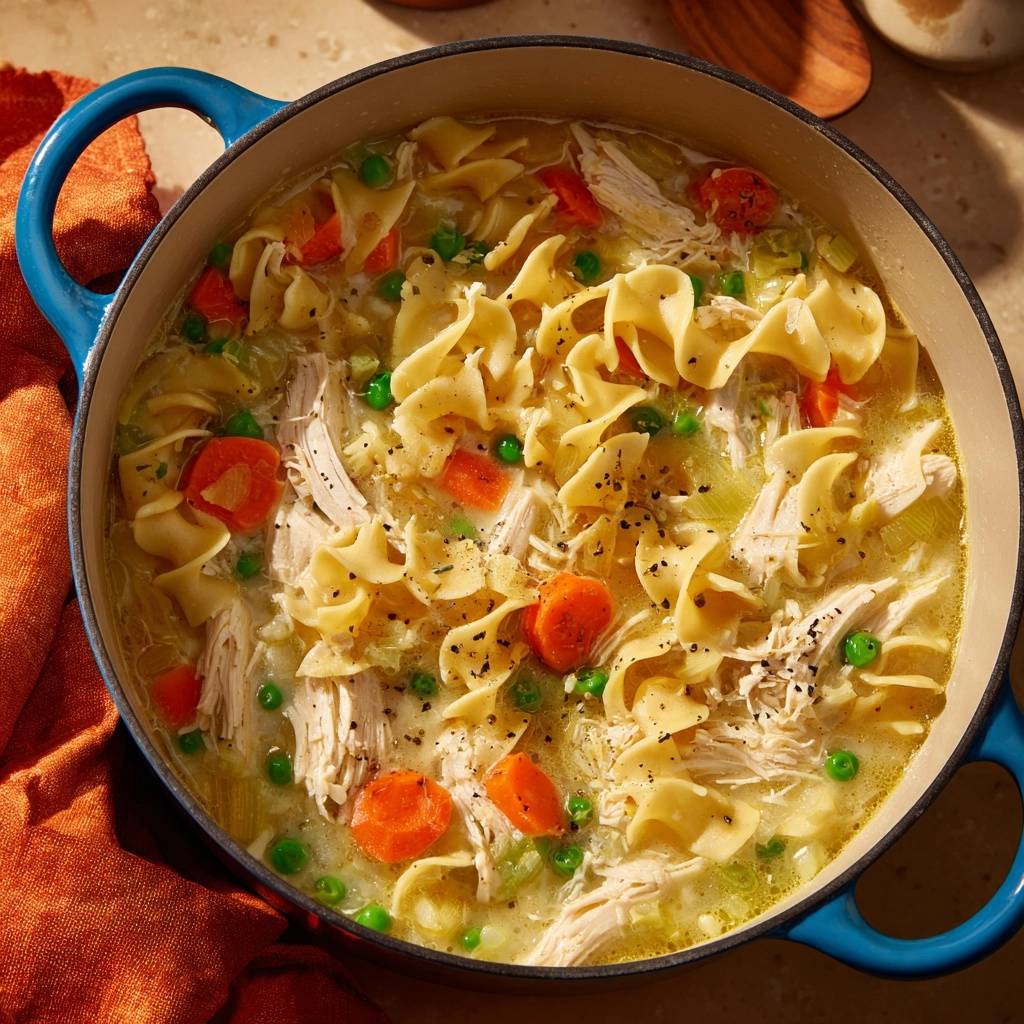 Half-and-half brings stable creaminess to creamy chicken noodle soup without curdling, thanks to its fat content. Butter sautees veggies for deep flavor, while chicken broth forms the savory base. Frozen peas add sweet pop, and cooked shredded chicken keeps it easy.