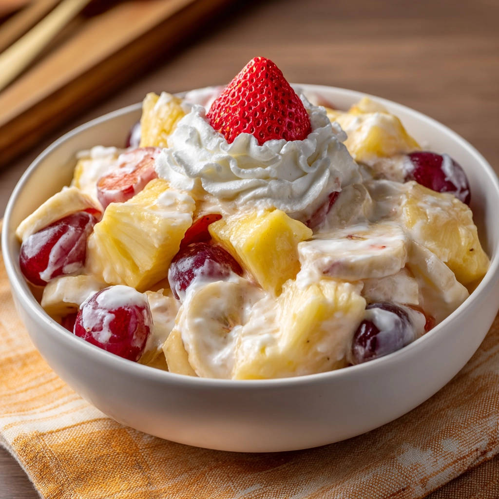 Compared to many other desserts, yes! It’s packed with vitamins, fiber, and antioxidants from the fresh fruit. The creamy dressing uses yogurt, which adds protein and probiotics. You can make it even lighter by using low-fat yogurt and reducing the added sugar, or omitting the whipped cream topping.