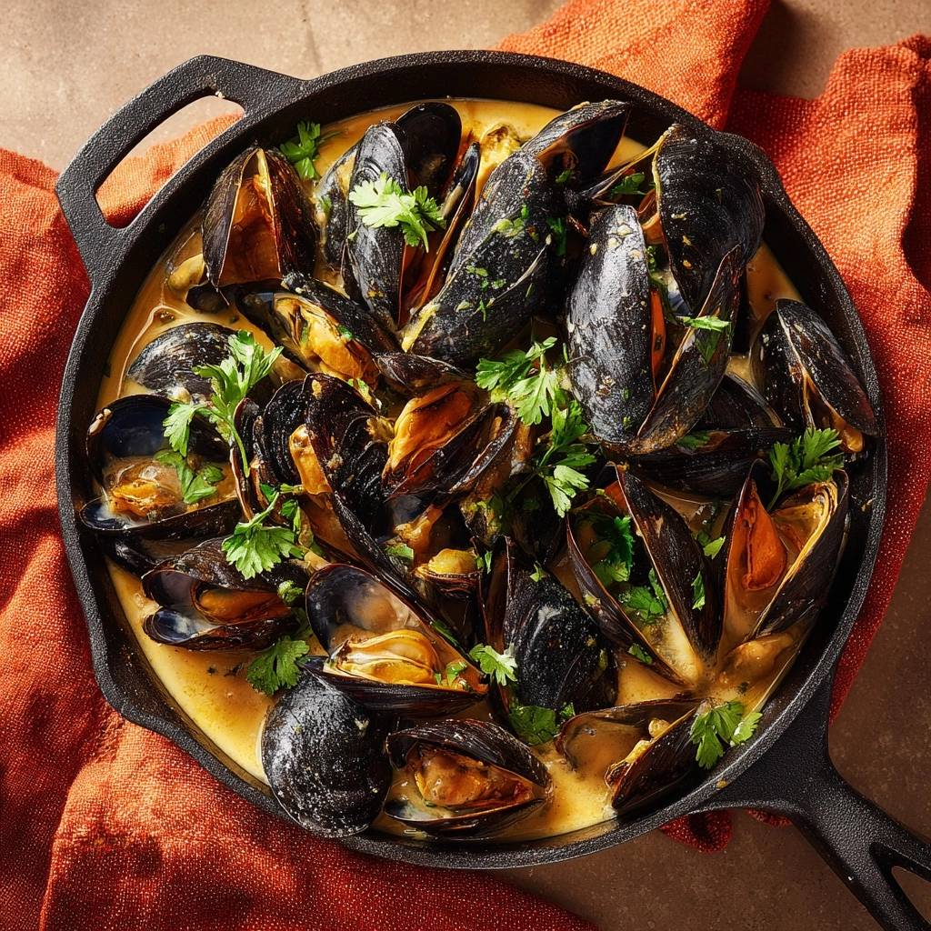Use coconut cream for dairy-free creamy garlic mussels. It thickens similarly with high fat. Swap chicken broth for veggie.