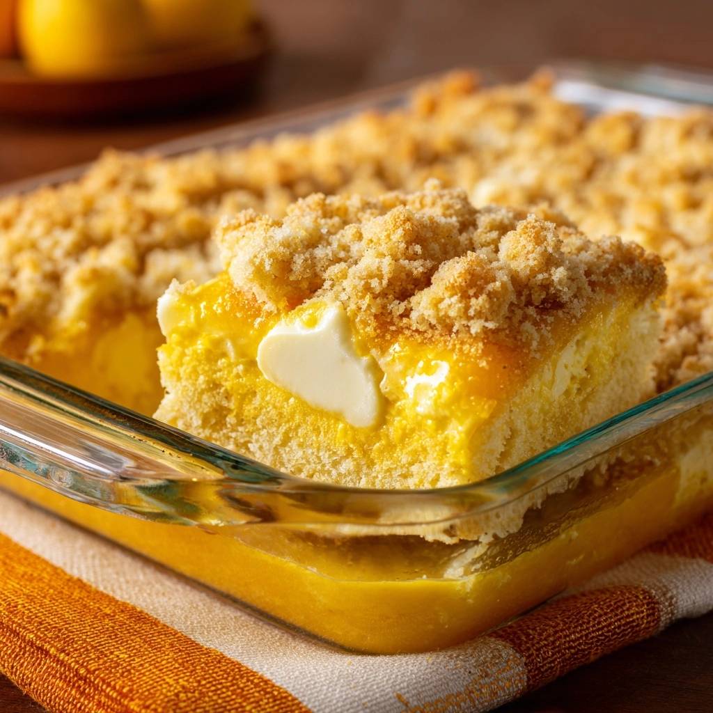 Bright lemon zest and juice cut through with sharp acidity. However, the sweet streusel and tender cake base balance it perfectly. Each layer shines: creamy yellow filling peeking through golden crumbs.