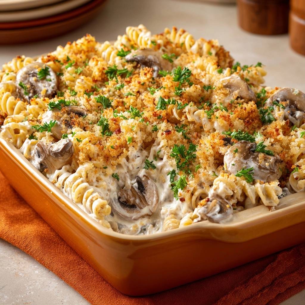 This dish shines because the rich heavy cream sauce coats the rotini perfectly, while caramelized mushrooms add deep umami. In addition, the foolproof crispy breadcrumbs contrast the creamy mushroom rotini casserole below. Unlike mushy versions, this one delivers texture you crave.