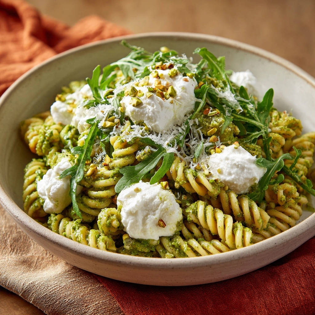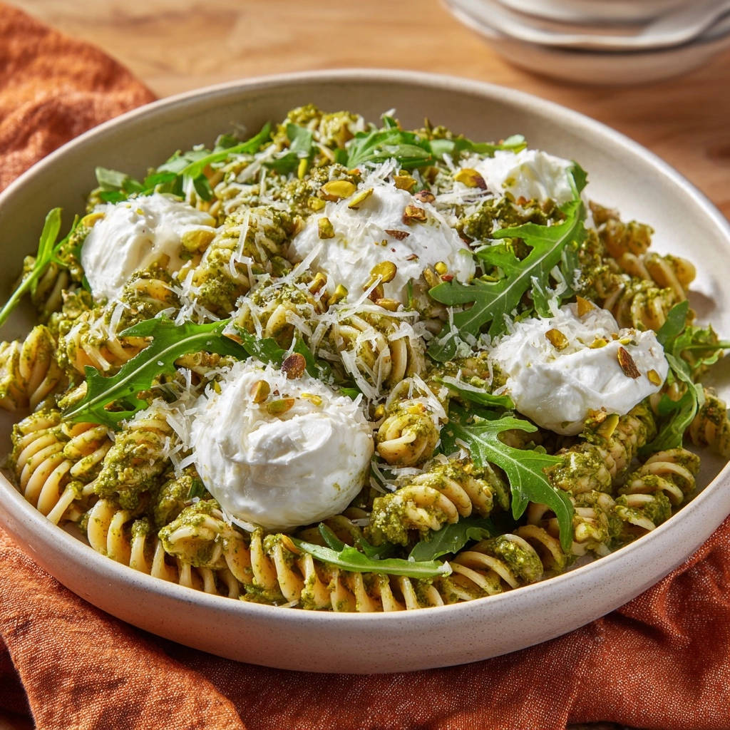 Serve your perfectly coated, flavorful Creamy Pesto Fusilli with Burrata immediately and savor every bite!